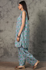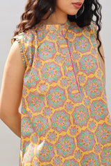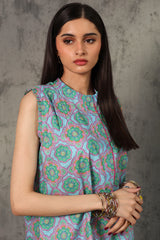 Printed classic-fit sleeveless shirt with a low band neckline accented with a contrast crochet trim. Subtle pleats enhance the shoulders and the back while the sleeves are finished with minimal ruffle detailing. Paired with a matching printed classic-fit shalwar.