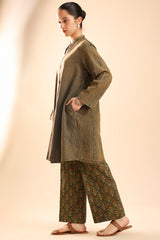 Textured paneled shirt with a low band neckline and an overlapping placket. Designed with side pockets for added ease. Paired with printed straight-fit trousers.