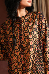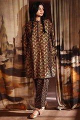An A-line paneled printed shirt with a low band neckline and buttons along the front placket, paired with classic-fit printed shalwar for a graceful look.