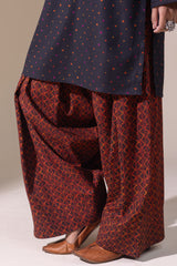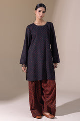 Classic-fit printed shirt with a round neckline adorned with subtle mukaish detailing. Paired with a complementary printed classic farshi shalwar.