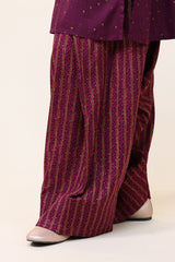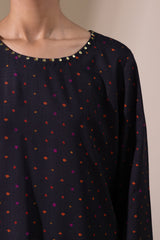 Classic-fit printed shirt with a round neckline adorned with subtle mukaish detailing. Paired with a complementary printed classic farshi shalwar.