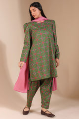 A classic-fit printed shirt with a round neckline and V-slit, adorned with dori detailing on the neckline and sleeve hems. Paired with a matching printed classic-fit shalwar.