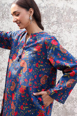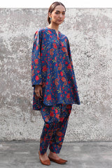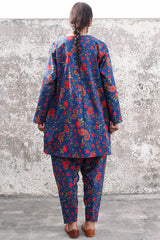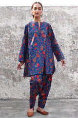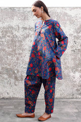 A relaxed-fit printed shirt with a round neckline and V-slit, adorned with playful tassel detailing. Designed with a rounded hem and back pleats to create a soft, flared silhouette. Paired with a matching printed pegged shalwar, finished with stitching details on the ankle hem for a cohesive, contemporary look.
