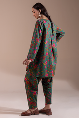 A relaxed-fit printed shirt with a round neckline and V-slit, adorned with playful tassel detailing. Designed with a rounded hem and back pleats to create a soft, flared silhouette. Paired with a matching printed pegged shalwar, finished with stitching details on the ankle hem for a cohesive, contemporary look.