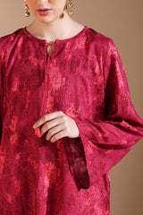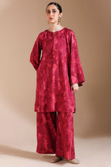 Denim-textured classic-fit printed shirt with a round neckline and V-slit, adorned with tassel detailing. Paired with matching printed culottes.