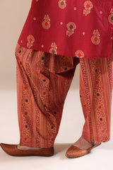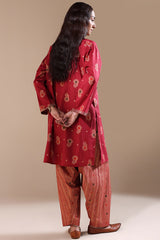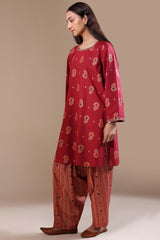 Gold-printed classic-fit shirt adorned with delicate embroidered detailing along the neckline and sleeve hems. Paired with a coordinated printed khula-poncha shalwar.