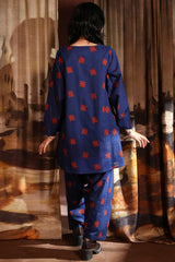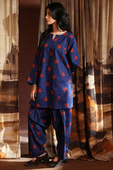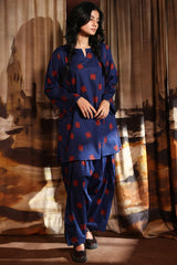 A classic-fit printed A-line paneled shirt with a round neckline and a V-slit, paired with a matching printed classic-fit shalwar.