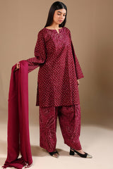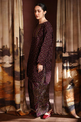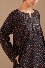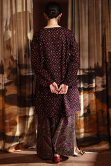 A classic-fit printed A-line shirt with a round neckline and V-slit, paired with a matching printed farshi shalwar for a graceful, traditional look.
