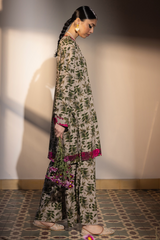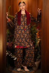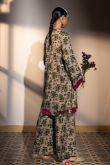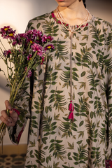Leaf printed classic-fits shirt with a round neckline and V-slit, adorned with tassel detailing. Paired with matching printed classic culottes.