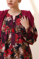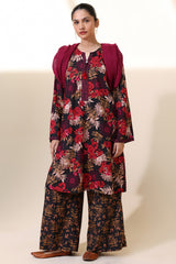 Floral printed classic-fit shirt with a round neckline and V-slit, adorned with tassel detailing. Paired with complementary printed culottes.