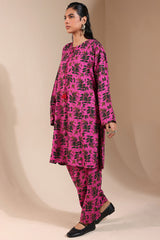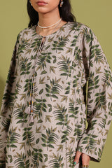 A classic-fit paneled printed shirt with a round neckline and V-slit, adorned with tassel detailing. Paired with a matching printed classic-fit shalwar.