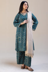 A classic-fit printed shirt with a V-neckline adorned with delicate embroidered details along the neckline and sleeve hems. Paired with matching printed culottes for a graceful, coordinated look.