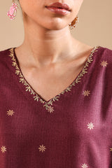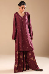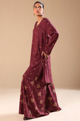 A classic-fit printed shirt with a V-neckline, adorned with delicate embroidery along the neckline and sleeve hems. Paired with printed flared trousers for an effortlessly graceful look.
