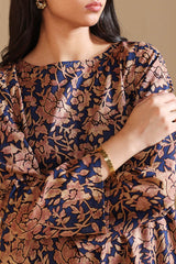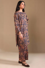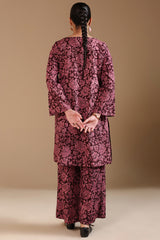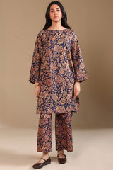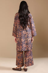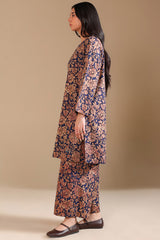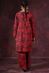 Classic-fit floral printed shirt with a round neckline, adorned with delicate mukaish detailing. Paired with matching printed culottes.