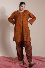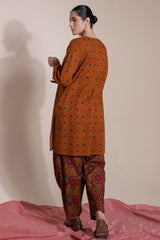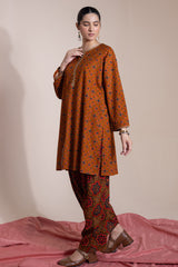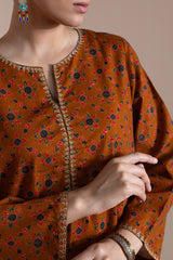 A classic-fit printed shirt with a round neckline and V-slit, adorned with delicate embroidered detailing on the neckline and sleeve hems. Paired with a complementary printed classic-fit shalwar.