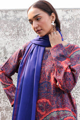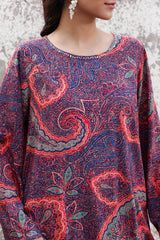 A classic-fit vibrant printed shirt with a round neckline adorned with mukaish detailing. Paired with a matching printed farshi shalwar featuring fine stitching along the borders.