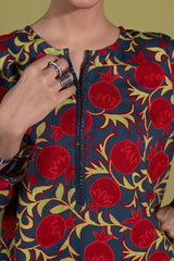 A classic-fit printed shirt with a round neckline and V-slit, adorned with tassel detailing. Paired with a complementary printed farshi shalwar featuring fine stitching details along the ankle hemline for a refined finish.