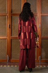 Classic-fit paneled printed shirt with a keyhole neckline and side tassel detailing. Paired with a complementary printed khula poncha shalwar.