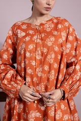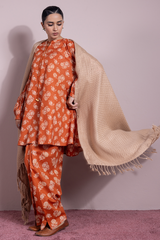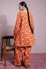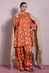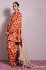 Classic-fit A-line printed shirt with a round neckline and V-slit adorned with tassel detailing. Finished with cuffed sleeves and paired with a classic-fit shalwar featuring slit detailing.