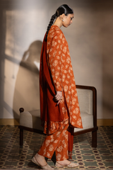 Classic-fit printed shirt with a low band neckline and a buttoned front placket. Features subtle gathers on the shoulders and back, cuffed sleeves, and a round hem. Paired with matching straight-fit trousers.