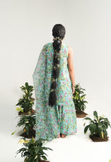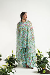 Drenched in festive flair, this classic-fit PK Rawsilk shirt blooms with painterly florals, featuring a round neckline with a V-slit, finished with dori piping. The kurta is adorned with scattered stud detailing. Paired with a matching printed farshi shalwar and a lightweight organza dupatta adorned with subtle studs, this ensemble captures effortless grace, an ode to tradition with a modern spirit, perfect for a soft yet striking Eid look.