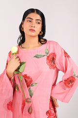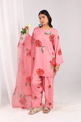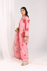 Fresh, feminine, and effortlessly elegant — this rosy pink printed ensemble brings floral charm to your everyday style. Featuring an all-over rose inspired print on a soft, breathable PK Rawsilk, the set includes a loose fit straight-cut shirt with round neckline, matching printed classic fit shalwar, and a matching printed organza dupatta. Whether you're dressing up for a casual get-together or a daytime celebration, this look strikes the perfect balance between comfort and style.
