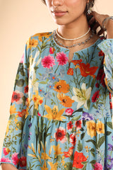 Long flared floral printed tiered dress with a round neckline and V-slit, adorned with delicate lace detailing along the neckline and sleeve hems. Soft gathers throughout creates a flowy silhouette.