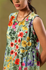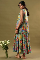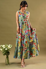 Long floral-printed tiered frock with delicate lace detailing along the neckline and sleeve hems. Soft gathers create a generous flare in the silhouette.