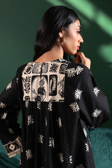 A long flared printed dress with a round neckline and soft gathers, creating a graceful, flowy silhouette. Finished with a keyhole detail and gentle gathers at the back for a classic look.