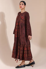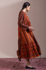 Long tiered printed dress with a round neckline and a keyhole slit, finished with tassel detailing along the sides for an artisanal touch. Soft gathers add graceful volume to the silhouette.