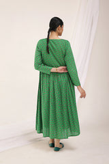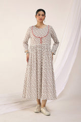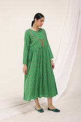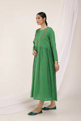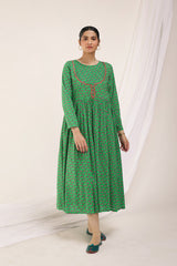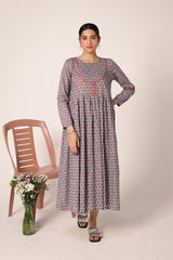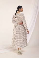 A subtle yet vibrant printed flared frock featuring a round neckline. The bodice is adorned with an attached koti, delicately embroidered along the edges and front button details. Gathers around the empire waist add a graceful flare to the silhouette. Pair with any Gen bottoms for a complete look.