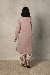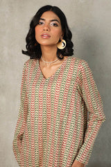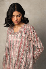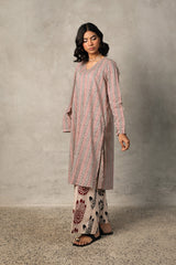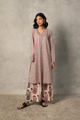 A loose-fit printed kurta in deep mehndi hues, featuring a V-neckline for an effortless appeal. Paired with contrasting mehndi chaap printed classic culottes, creating a seamless blend of tradition and style.