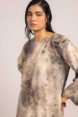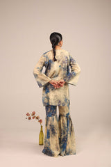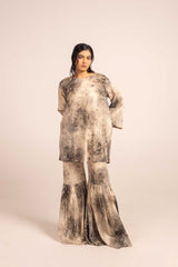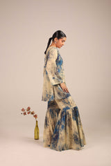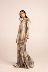 An easy-fit kurta bursting with a splash of color print, featuring a round neckline. Adorned with delicate gota details all over. Paired with a matching printed gharara, creating a lively, festive statement look.