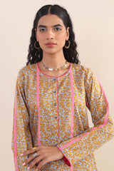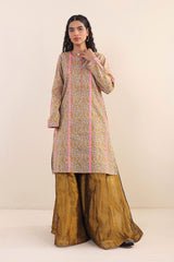 A long straight printed shirt with piping details, full sleeves and buttons on placket.