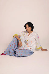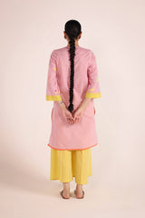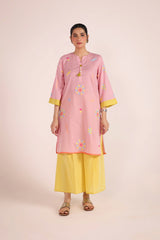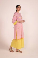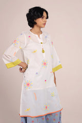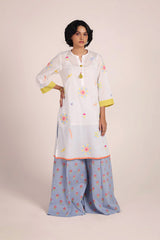 A classic-fit, dotted-textured embroidered kurta features a round neckline with a V-slit, adorned with buttons and tassel detailing. It is enhanced with delicate pastel embroidery. Can be paired with any generation fits for a chic look.