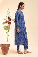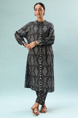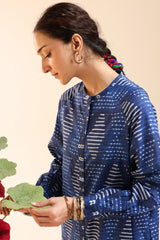 Shibori printed classic-fit shirt with a low band neckline and buttons along the front placket, featuring a subtle front opening. Designed with easy drop shoulders and functional side pockets, finished with cuffed sleeve hems. Paired with coordinated printed straight-fit trousers.