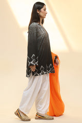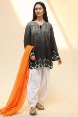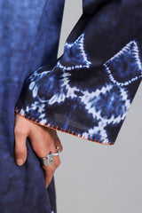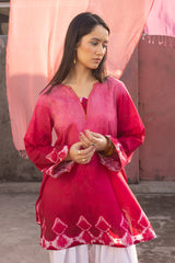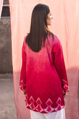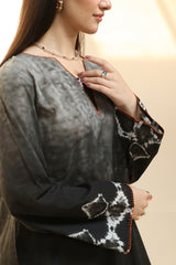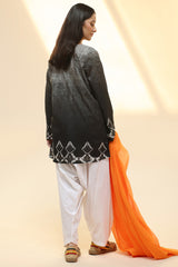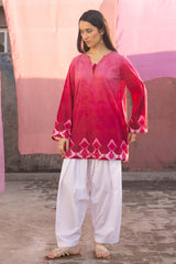 Printed classic-fit shirt with a round neckline and V-slit, adorned with delicate stitching along the neckline and sleeve hems.