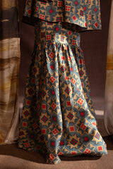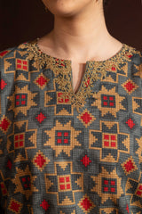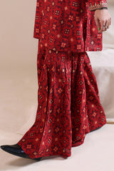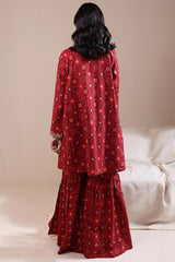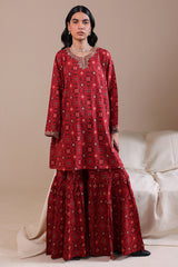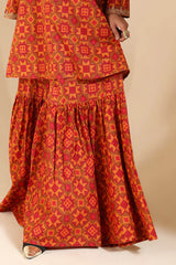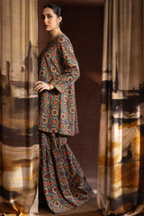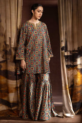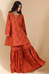 A relaxed-fit A-line printed shirt with a round neckline and V-slit, adorned with delicate embroidered detailing on the neckline and sleeve hems. Paired with matching printed gharara.