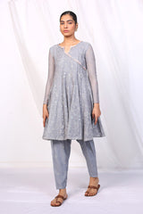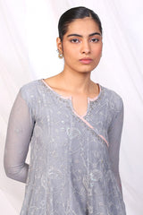 A short peplum shirt with embroidery on net, boat neckline with dip, long fitted sleeves and paired with embroidered net pegged shalwar.