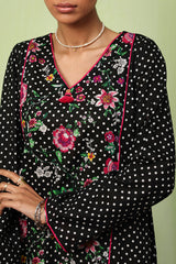 A vibrant printed paneled kurta featuring a V-neckline adorned with delicate tassel details. The neckline, sleeve hem, and panels are accentuated with dori piping, adding a refined touch. Paired with matching printed culottes, this ensemble strikes a perfect balance between tradition and contemporary style.
