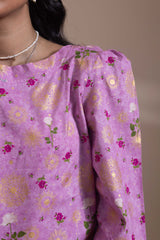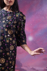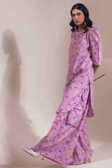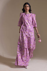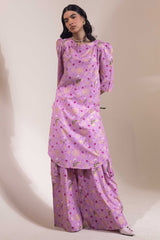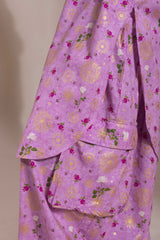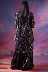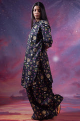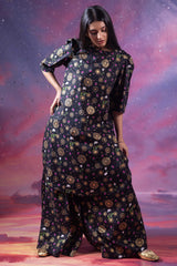 Luxury gold-printed classic-fit shirt with a shawl-collar neckline, puff sleeves, and a rounded hem. Paired with matching printed cargo pants featuring a wide hem and side pockets, this ensemble combines statement elegance with comfort.