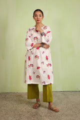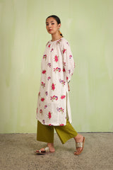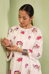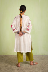A classic-fit embroidered kurta features a round neckline with subtle Mukesh detailing on the placket. Gentle gathers around neckline add elegance, while soft floral embroidered motifs enhance its textured fabric. Paired with solid-hued classic culottes, it creates a refined yet effortless look.