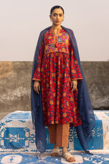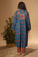 Printed flared shirt with a low band neckline and tassel detailing along the front placket. Soft gathers at the bodice enhance the flared silhouette. Paired with coordinated printed straight-fit trousers.