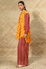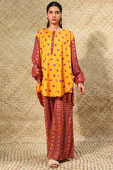 Printed classic-fit shirt with a round neckline and buttoned front placket. Featuring subtle drop shoulders and cuffed sleeve hems, finished with a round hem. Paired with coordinated printed culottes.