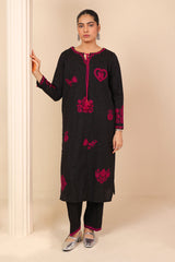 A loose fit shirt with round neckline with V slit, featuring embroidered motifs all over on speckled base and embroidery details on sleeve hems, along with tassel detailing on the front. Paired with a solid straight fit trouser with embroidery on trouser hem.