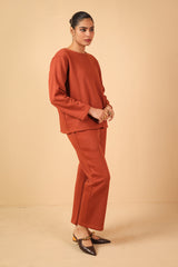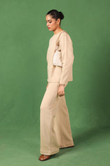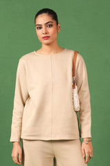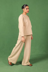 Fleece, round neckline short top with top stitch details, paired with loose fit tousers.