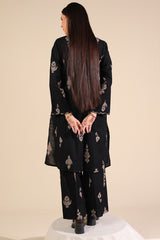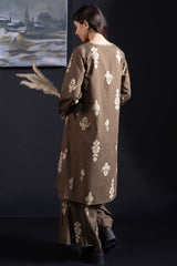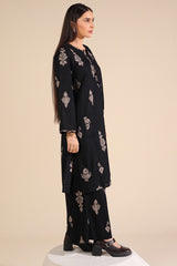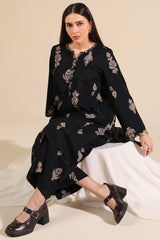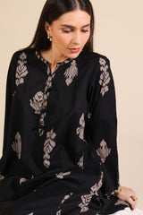 A classic-fit printed shirt with a round neckline and V-slit, adorned with tassels along the front placket. Paired with matching printed culottes for a coordinated look.