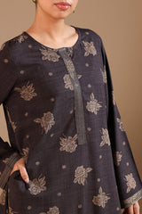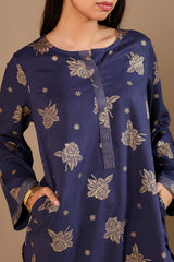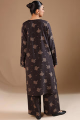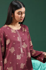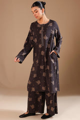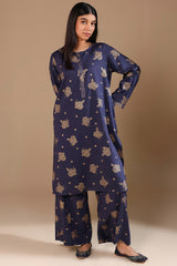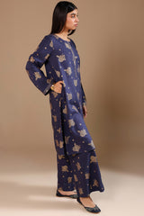 A classic-fit printed shirt with a round neckline and V-slit, featuring delicate stitching details along the front placket and sleeve hems. Side pockets add ease. Paired with matching printed culottes.