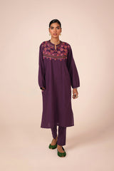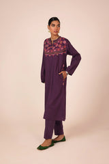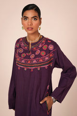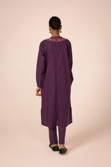 A relaxed-fit kurta featuring a band round neckline with a V-slit. The bodice is adorned with delicate, colorful embroidery—an exquisite display of diverse hand-stitching techniques. Side pockets and cinched sleeves are thoughtfully detailed with intricate stitches, while the back neckline mirrors the artistry with delicate embroidery. Paired with solid-hued straight-fit trousers.