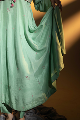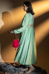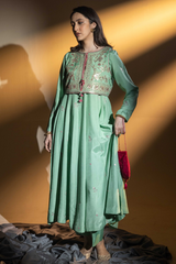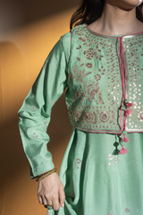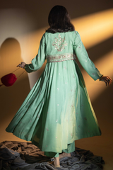A luxurious long flared shirt adorned with delicate sequin and embroidered detailing. Styled with a sleeveless, classic-fit koti richly embroidered with sequins and finished with playful tassel accents for a festive touch. Paired with straight-fit trousers to complete the graceful ensemble.